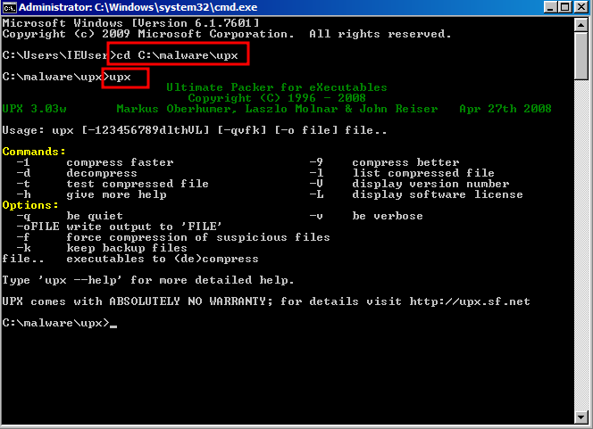 cd C:\malware\upx를 입력하여 upx 폴더로 이동 후, upx를 입력하여 upx 프로그램 정보를 확인한다.