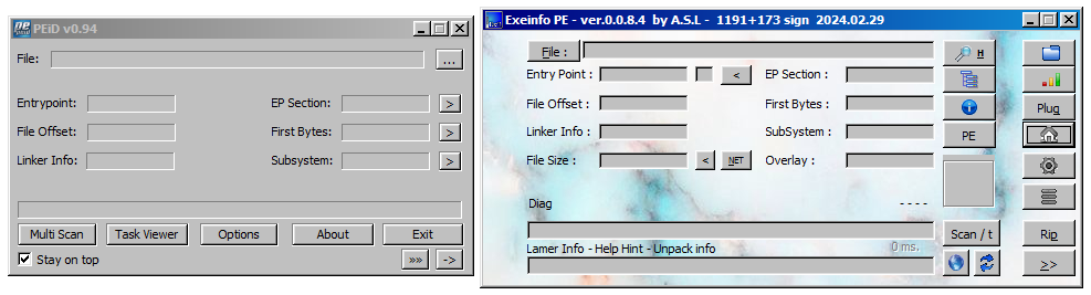 PEiD와 Exeinfo PE는 파일의 컴파일 언어와, 패킹 여부를 확인할 수 있는 정적 분석 도구이다.