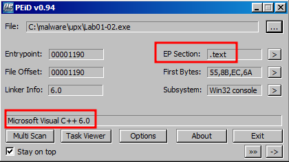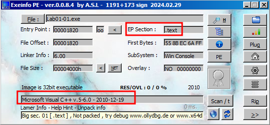 Microsoft Visual C++6.0 으로 컴파일 된 것으로 보아 Lab01-01.exe 파일은 패킹되지 않은 파일임을 알 수 있다. 패킹되어 있는 경우 Microsoft Visual C++6.0 부분에 패킹 툴의 정보가 출력된다.