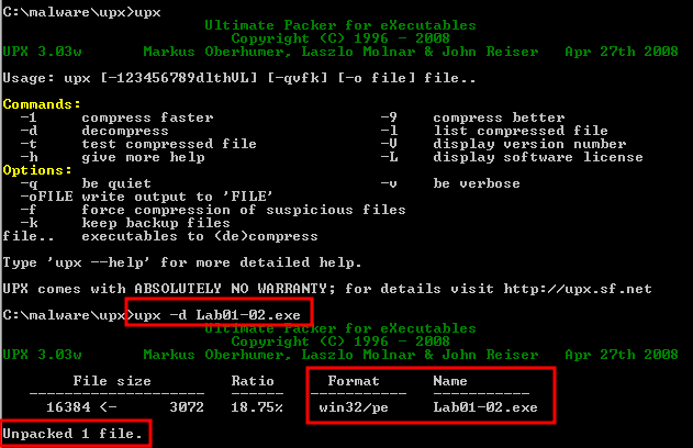 upx -d Lab01-02.exe를 입력하여 언패킹(압축해제)한다.