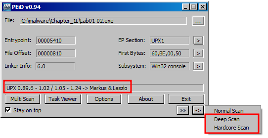 그림4의 EP Section 확인 시 UPX1이 확인된다. 이는 UPX라는 툴로 패킹되었다는 의미로, 상세 스캔을 위해 우측 하단의 -> 아이콘을 클릭하여 Deep Scan 또는 Hardcore Scan 으로 스캔을 진행한다.