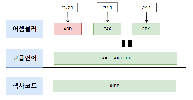- 어셈블리 코드는 한 가지 동작까지 세세하게 지정한다.