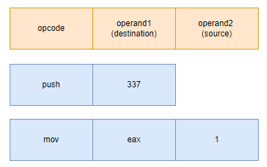- 기본 형태: 명령어(옵코드, opcode) + 인자(오퍼랜드, operand 1 ~ 2)