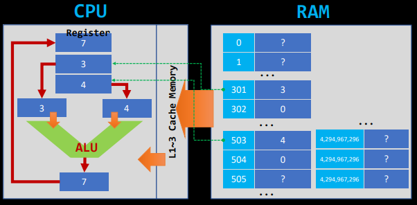 - RAM의 정보 → CPU의 레지스터(Register) → ALU(연산) → RAM