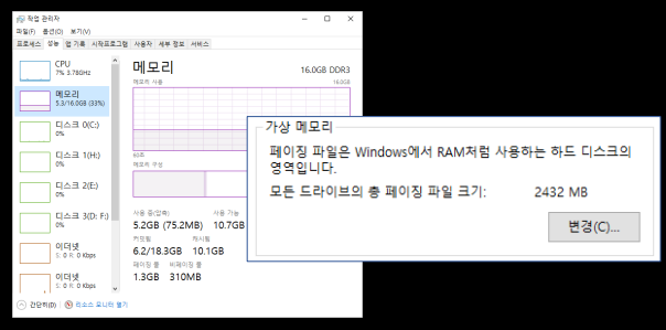 - 가상 메모리 = RAM과 HDD를 섞어서 하나의 논리적 메모리로 사용하는 것