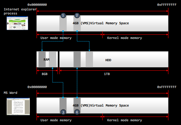 - 가상 메모리 = RAM과 HDD를 섞어서 하나의 논리적 메모리로 사용하는 것