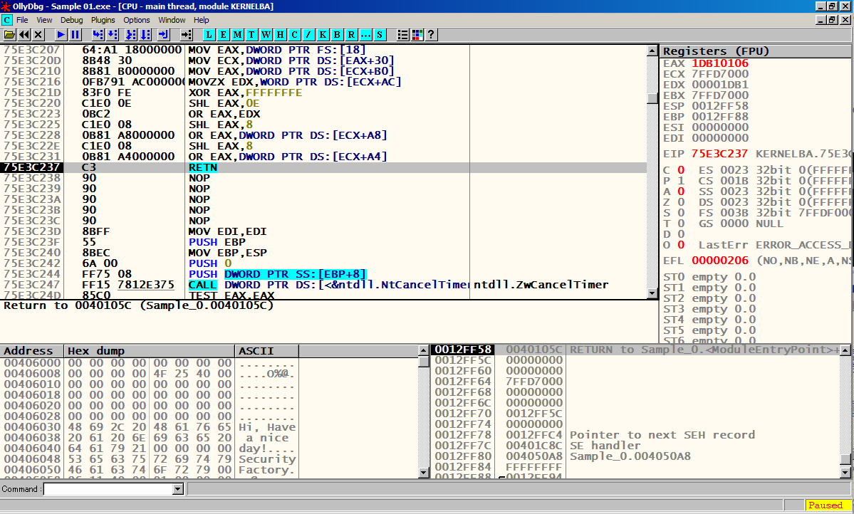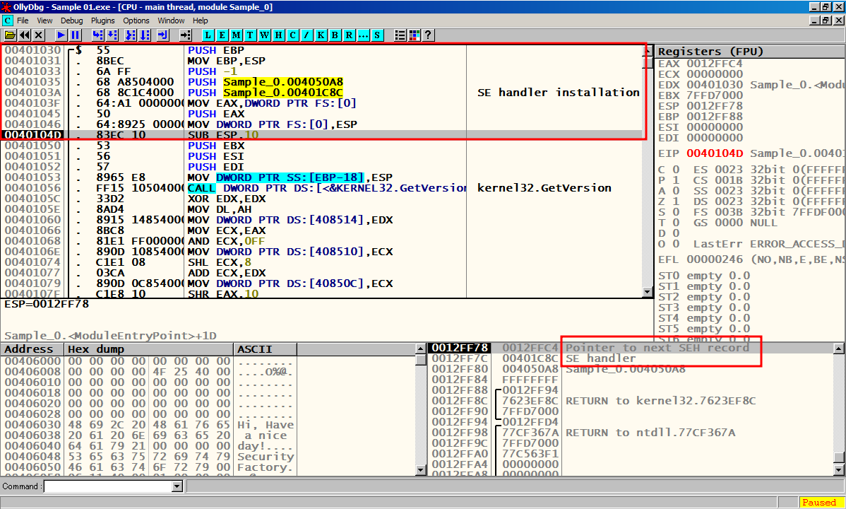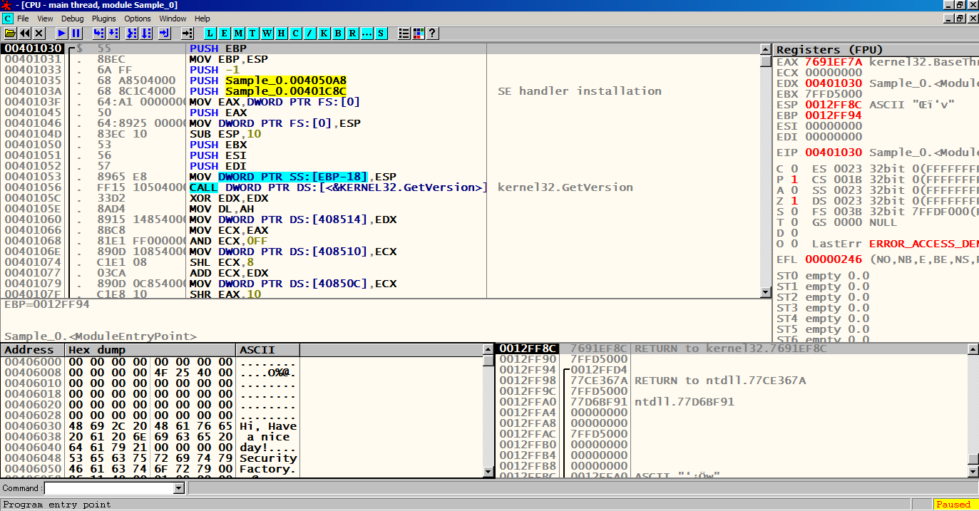 F8을 눌러서 한칸씩 실행 시켜 메인 함수 Sample_0.00401000에 도달한다.