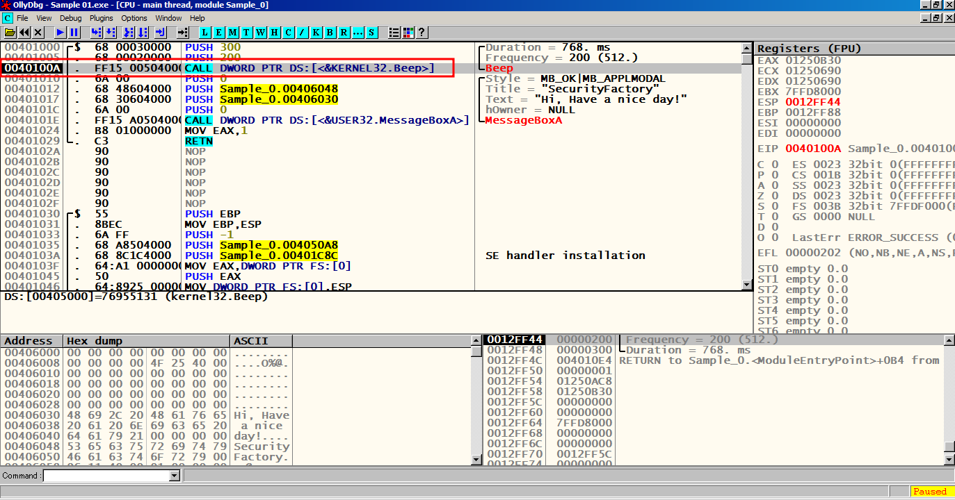 F8로 한칸씩 실행시켜 KERNEL32.Beep 에 도달하게 되면, Beep 음을 발생시킨다.