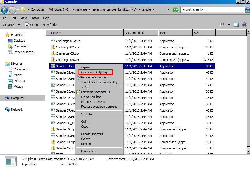 올리디버거 아이콘을 더블클릭하여 실행해도 되지만, 분석할 파일을 마우스 우측 클릭 후 Open as OllyDbg를 클릭하여 실행도 가능하다.