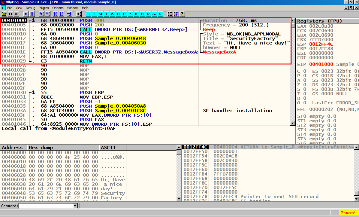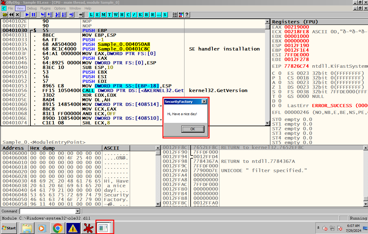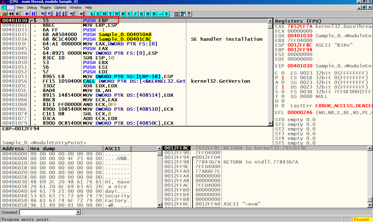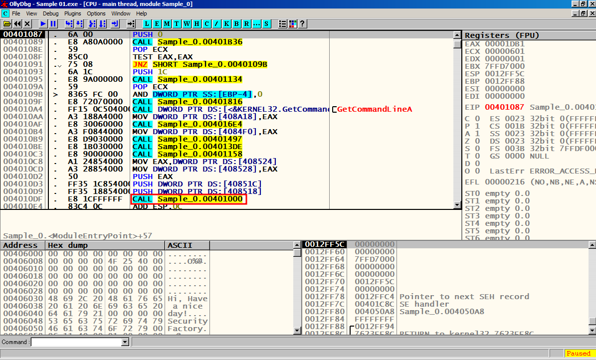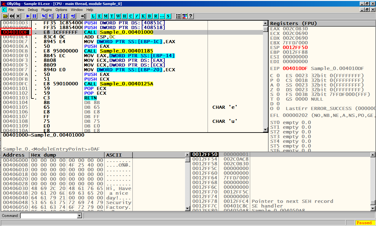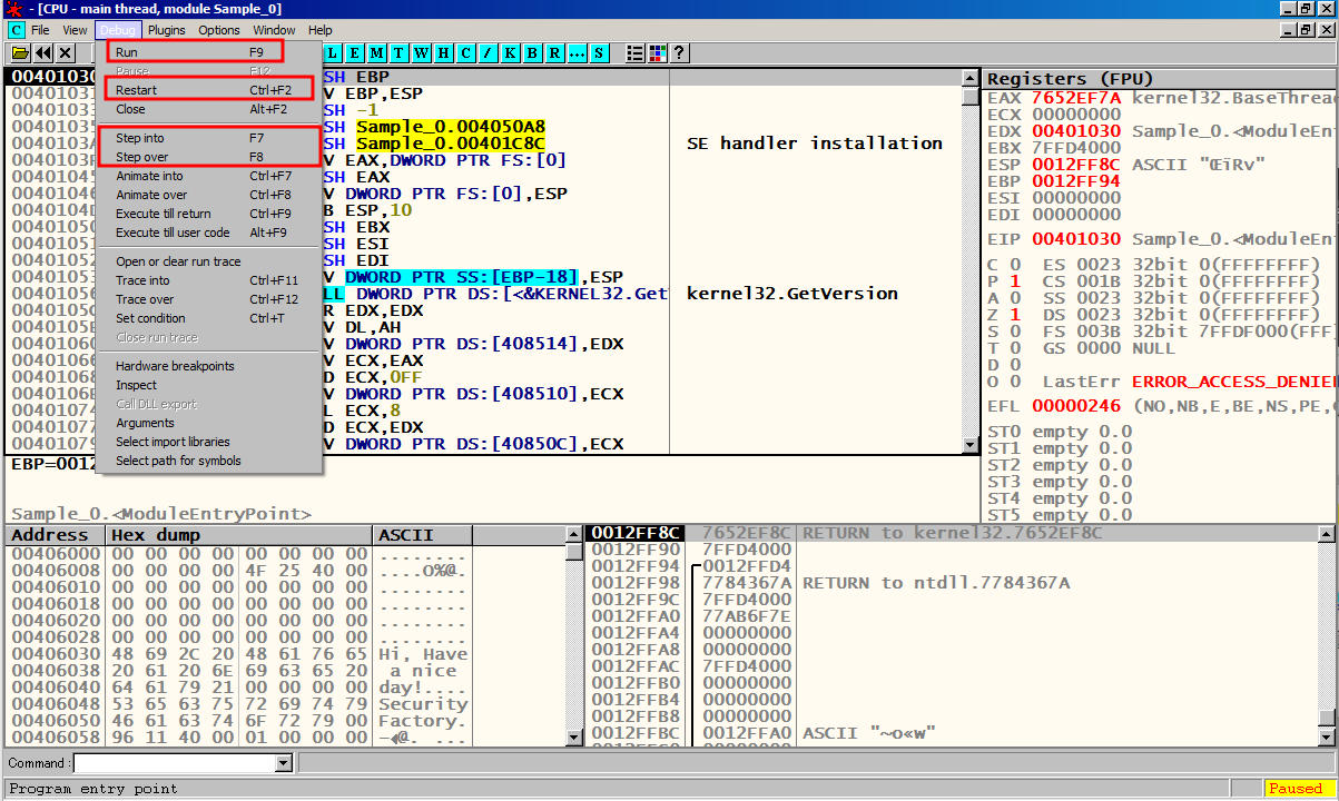 F8을 눌러서 한칸씩 실행 시켜 메인 함수 Sample_0.00401000에 도달한다.