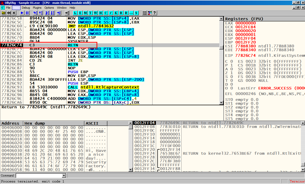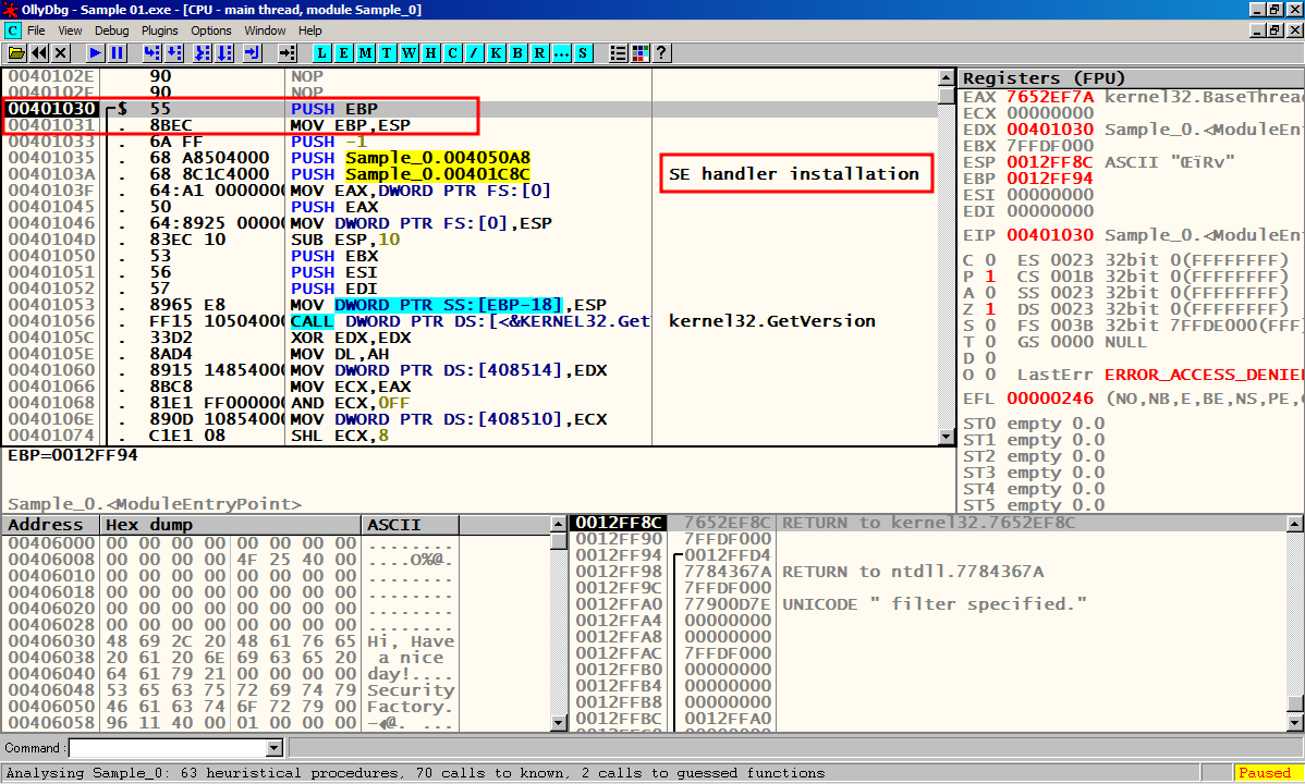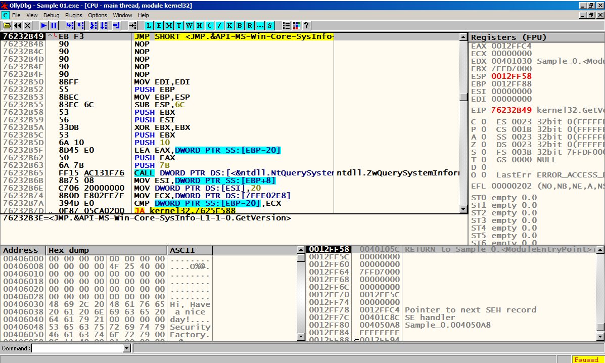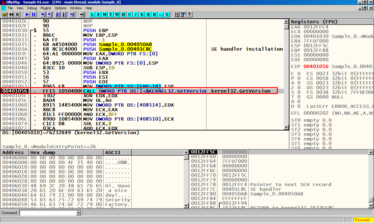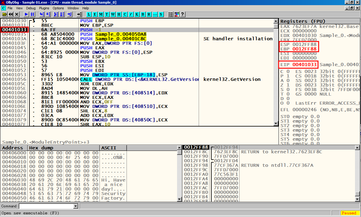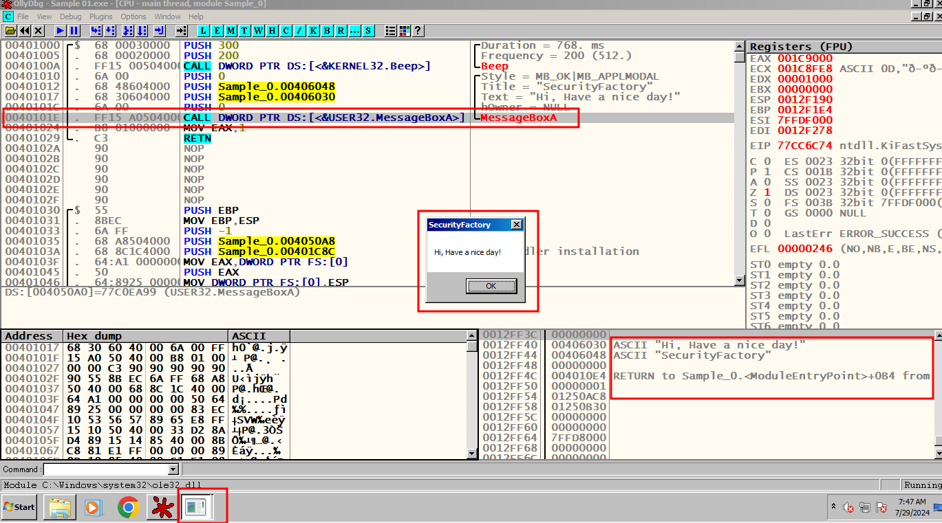 F8을 눌러서 한칸씩 실행 시켜 메인 함수 Sample_0.00401000에 도달한다.