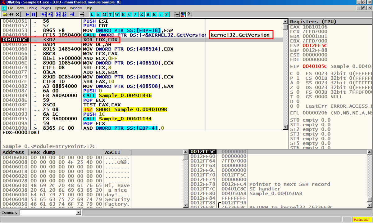 CALL 함수 (GetVersion) 내부에서 F8을 눌러 한칸씩 실행시킨다.