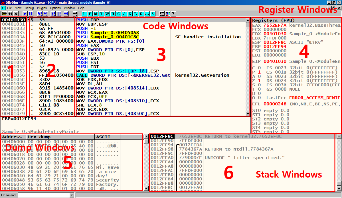 Code Windows: 디스어셈블 코드를 보여주는 창 (1,2,3번)