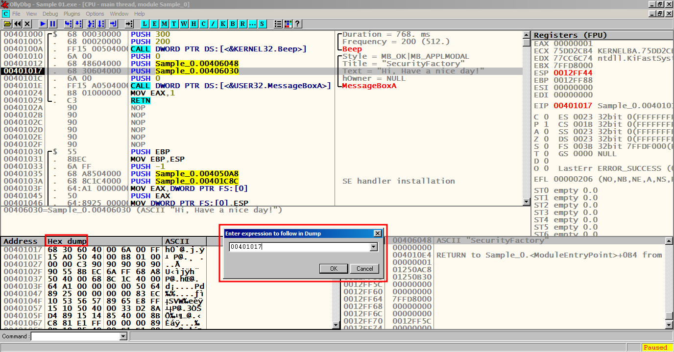 Sample_0.00401000 이 확인되는데, 이는 이 프로그램의 베이스코드로 실제 메인함수에서 사용한다.