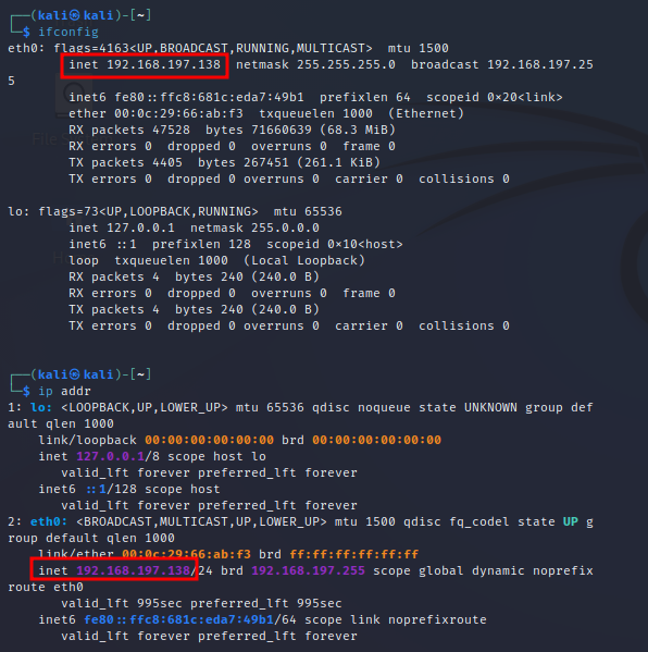 ifconfig 또는 ip addr 명령어를 입력하면 칼리리눅스의 IP 주소 및 네트워크 구성 정보를 확인할 수 있다.