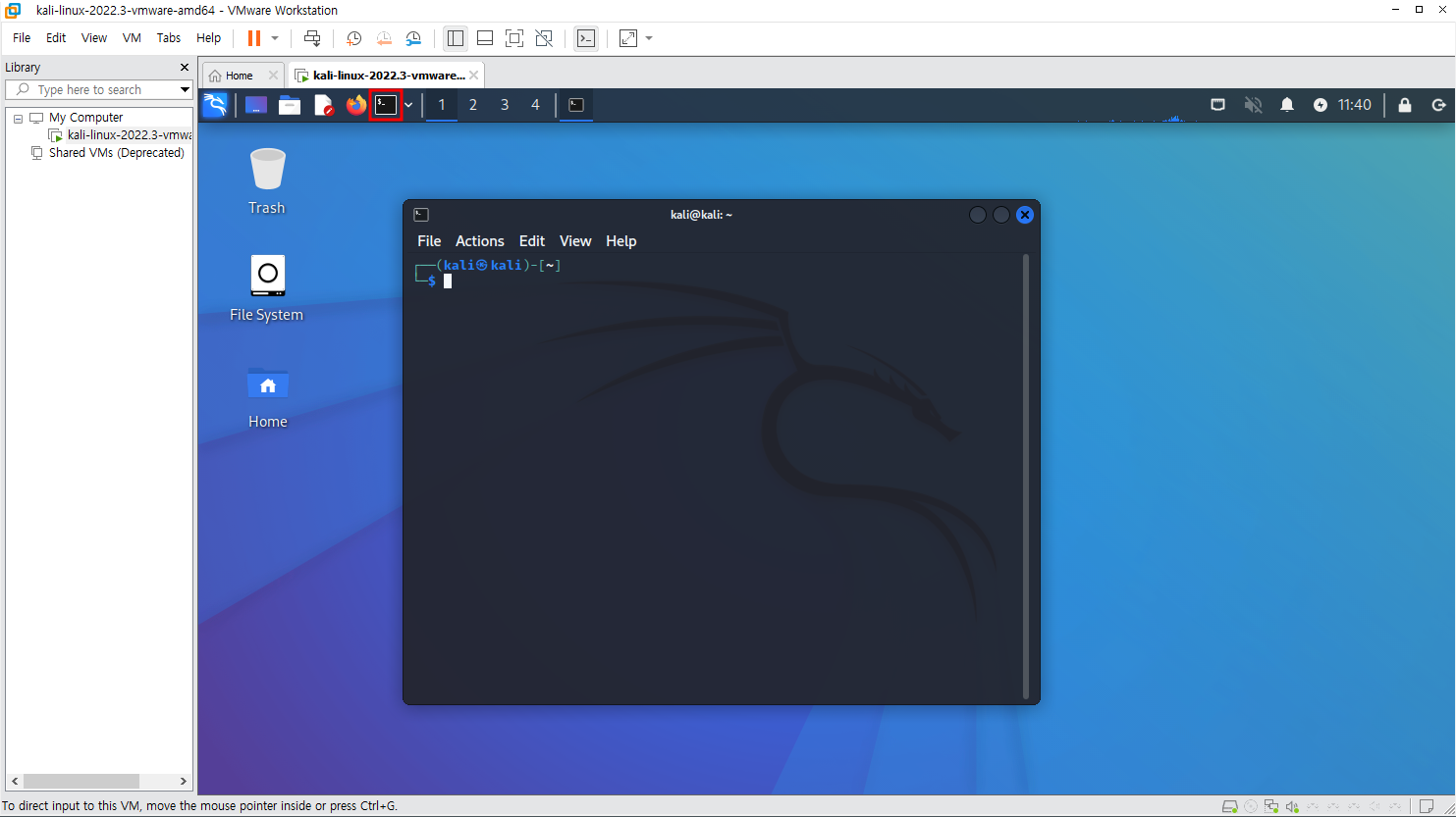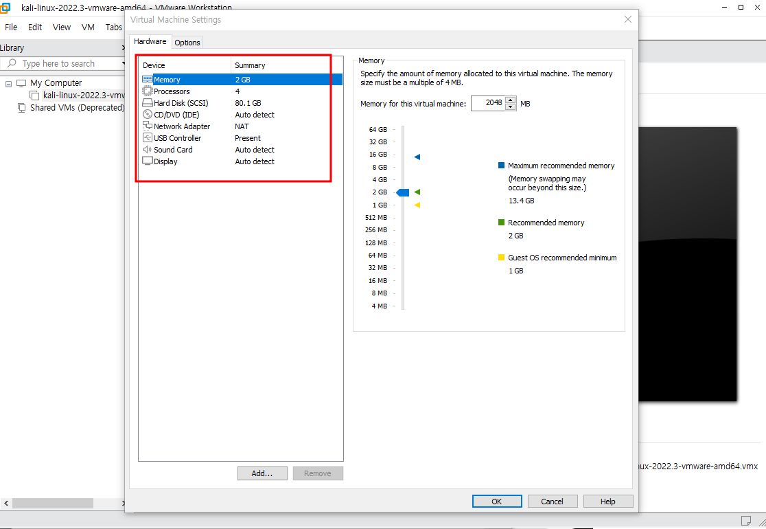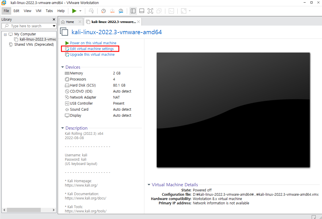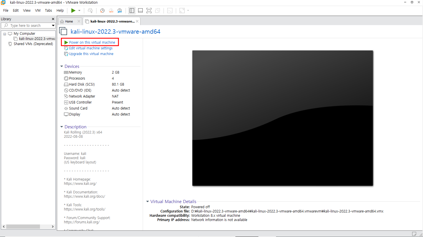 칼리리눅스 설치 경로: D:\kali-linux-2022.3-vmware-amd64\kali-linux-2022.3-vmware-amd64.vmwarevm