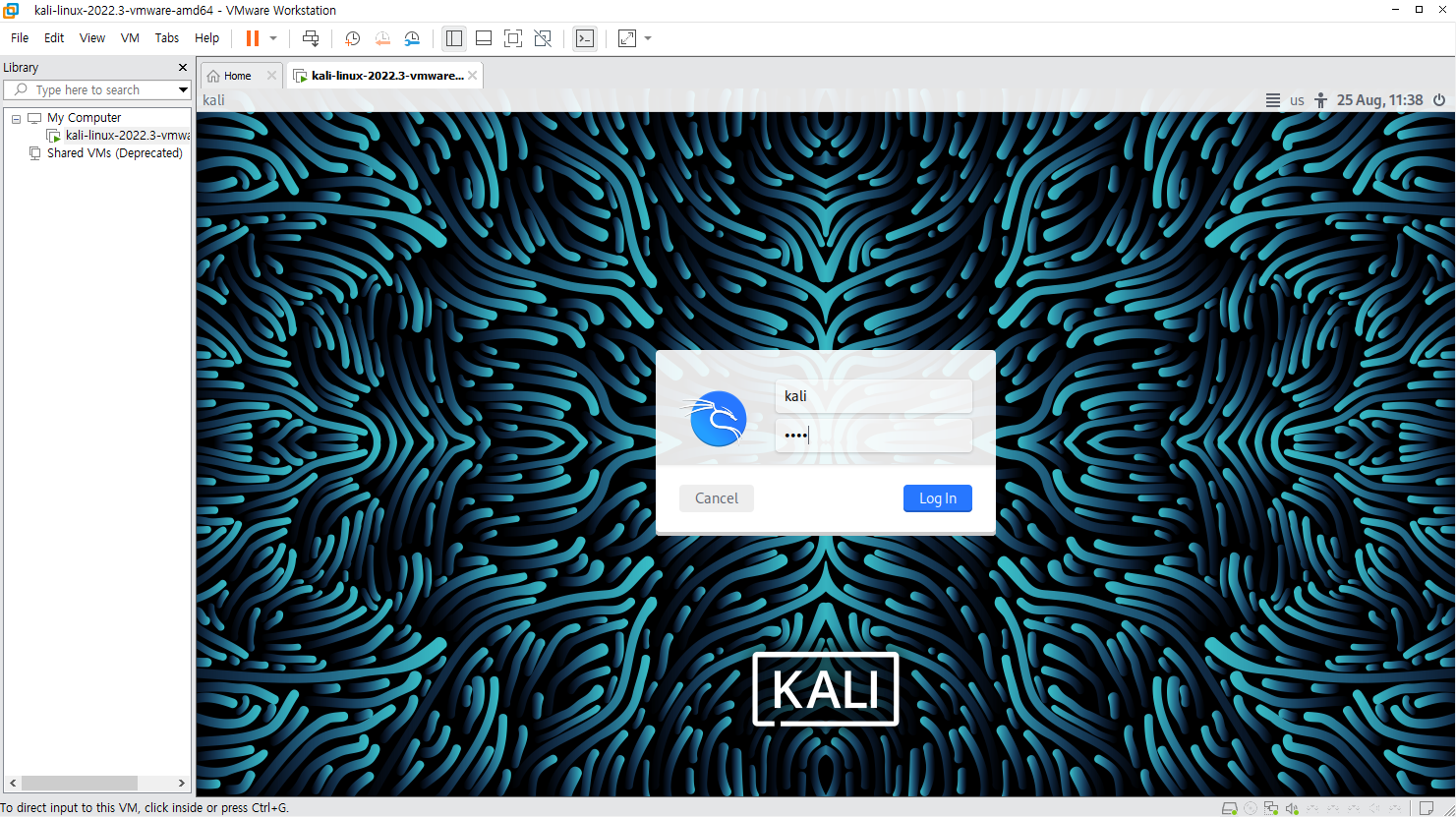 칼리리눅스 기본 ID와 PW는 kali 를 입력하여 접속한다.