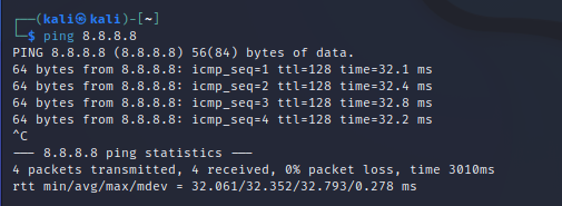 네트워크 테스트를 위해 8.8.8.8(구글 DNS 서버)로 ping 명령어를 사용한다.