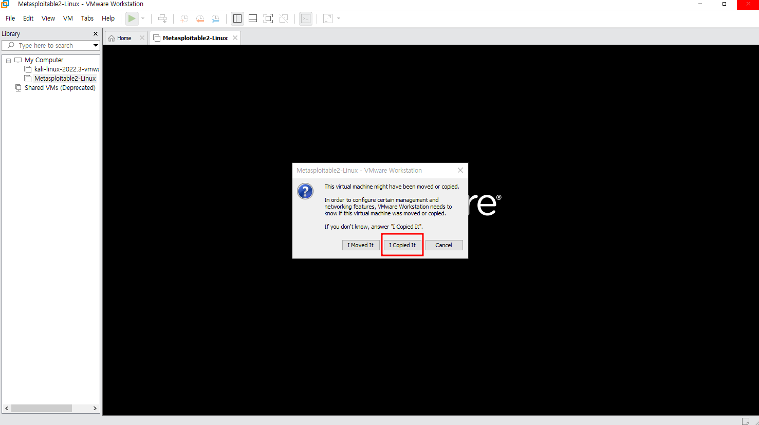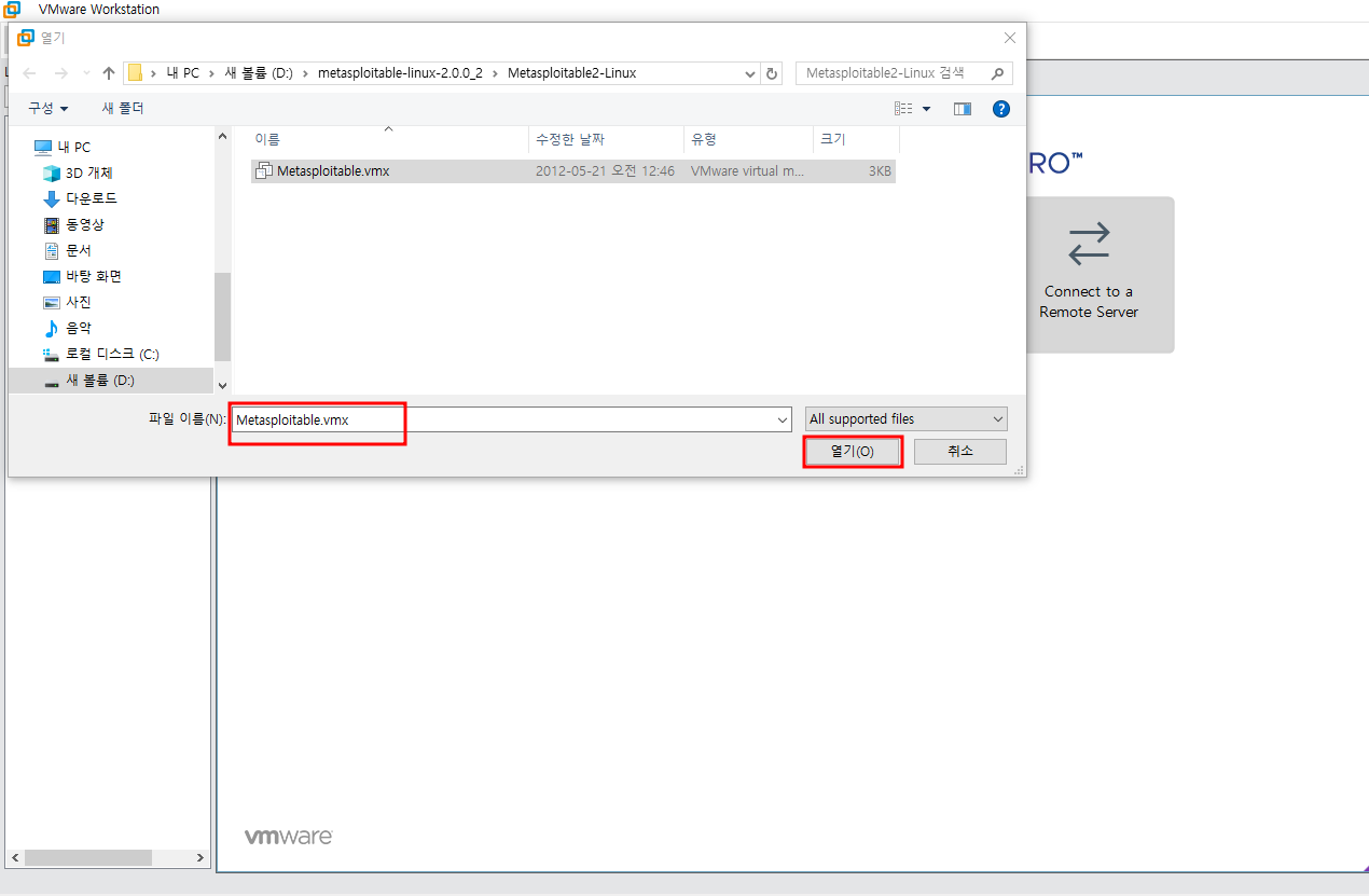 그림1의 File - Open 을 클릭하여 D드라이브에서 Metasploitable2 압축해제 파일의 VMX 파일을 불러온다.