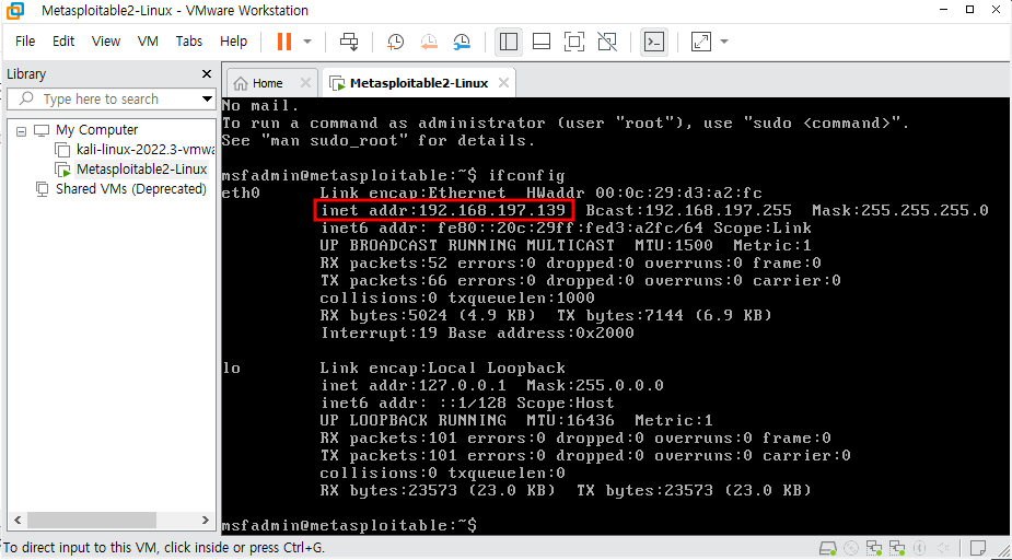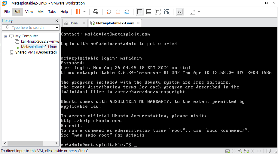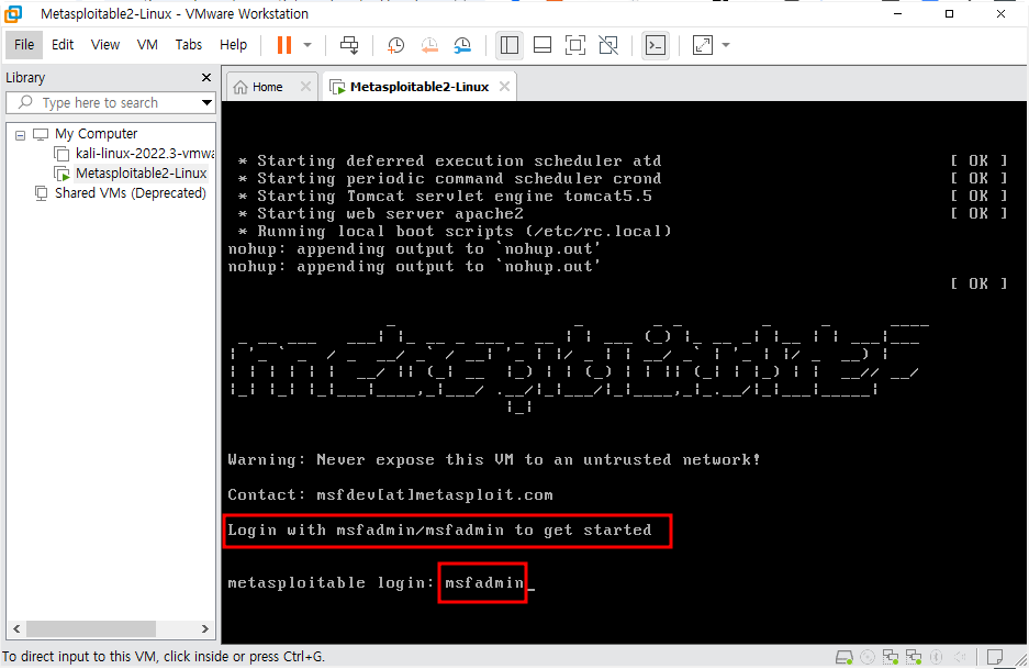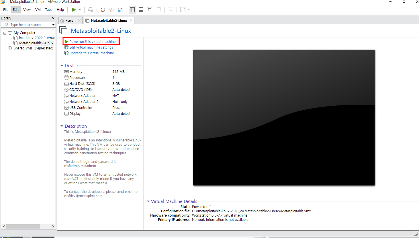 Metasploitable2 설치 경로: D:\metasploitable-linux-2.0.0_2\Metasploitable2-Linux