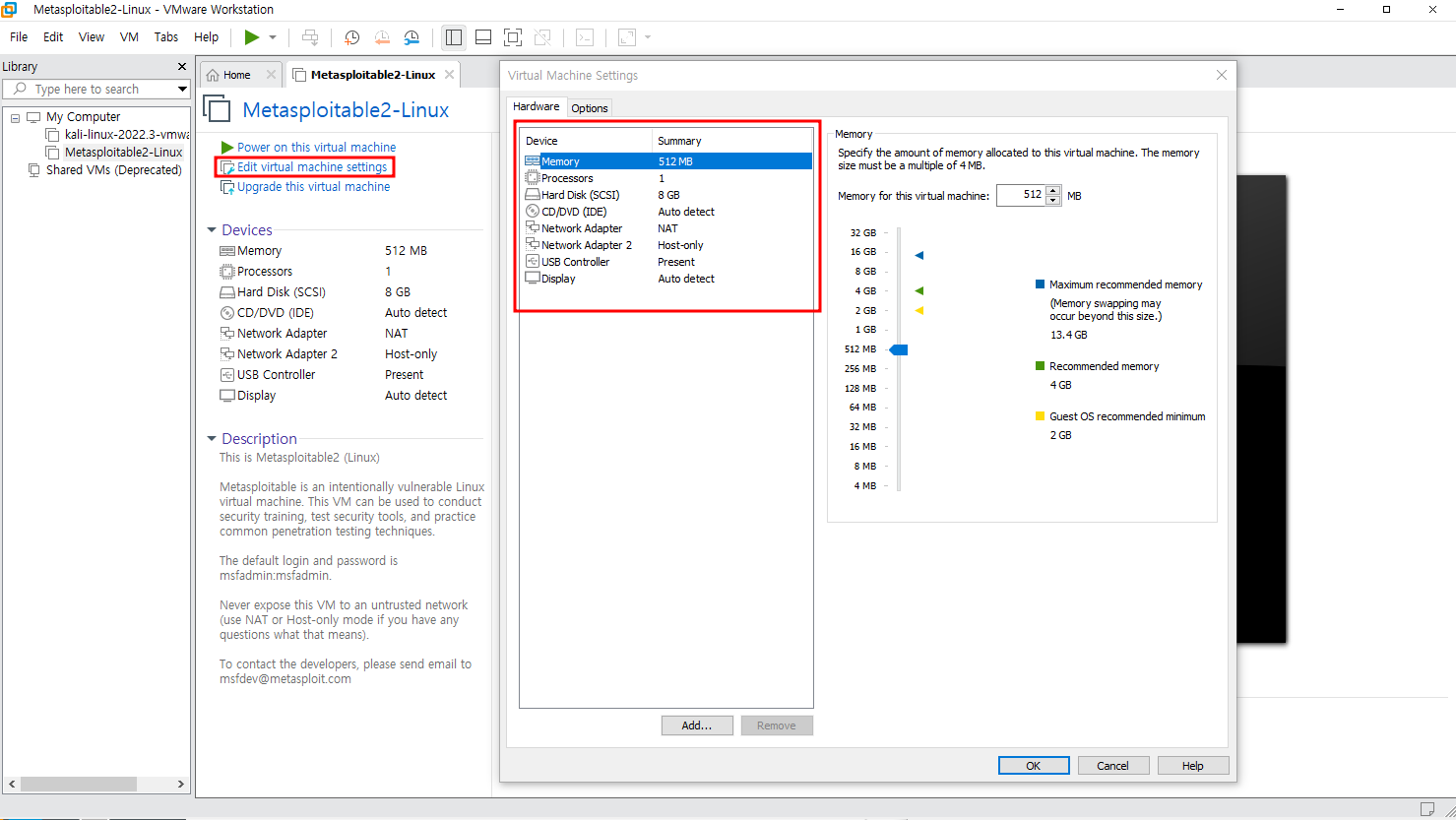 Metasploitable2를 불러온 후 Edit virtual machine settings 를 클릭하여 환경설정을 한다.