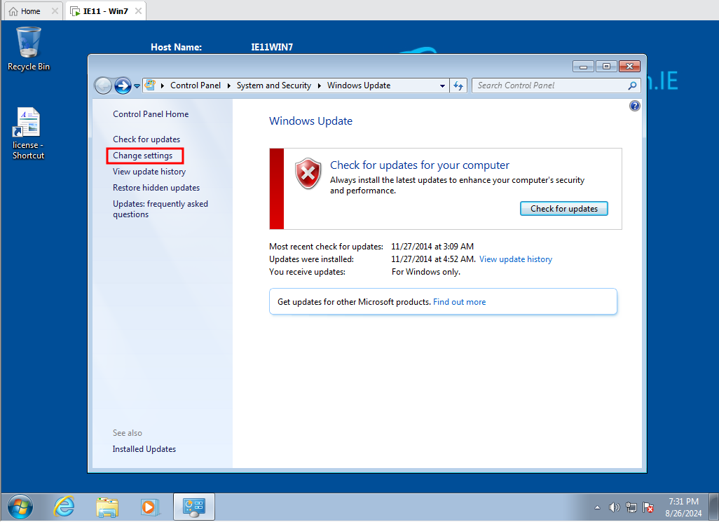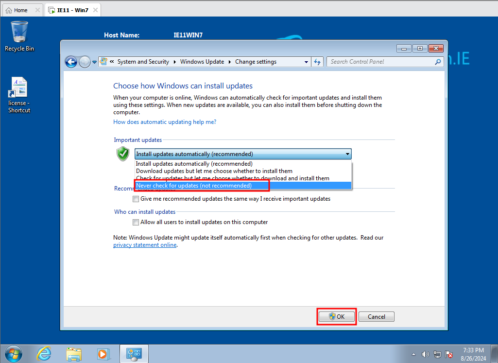 취약한 환경을 유지하기 위해 윈도우 자동 업데이트 설정을 업데이트 하지 않는 것으로 변경한다.