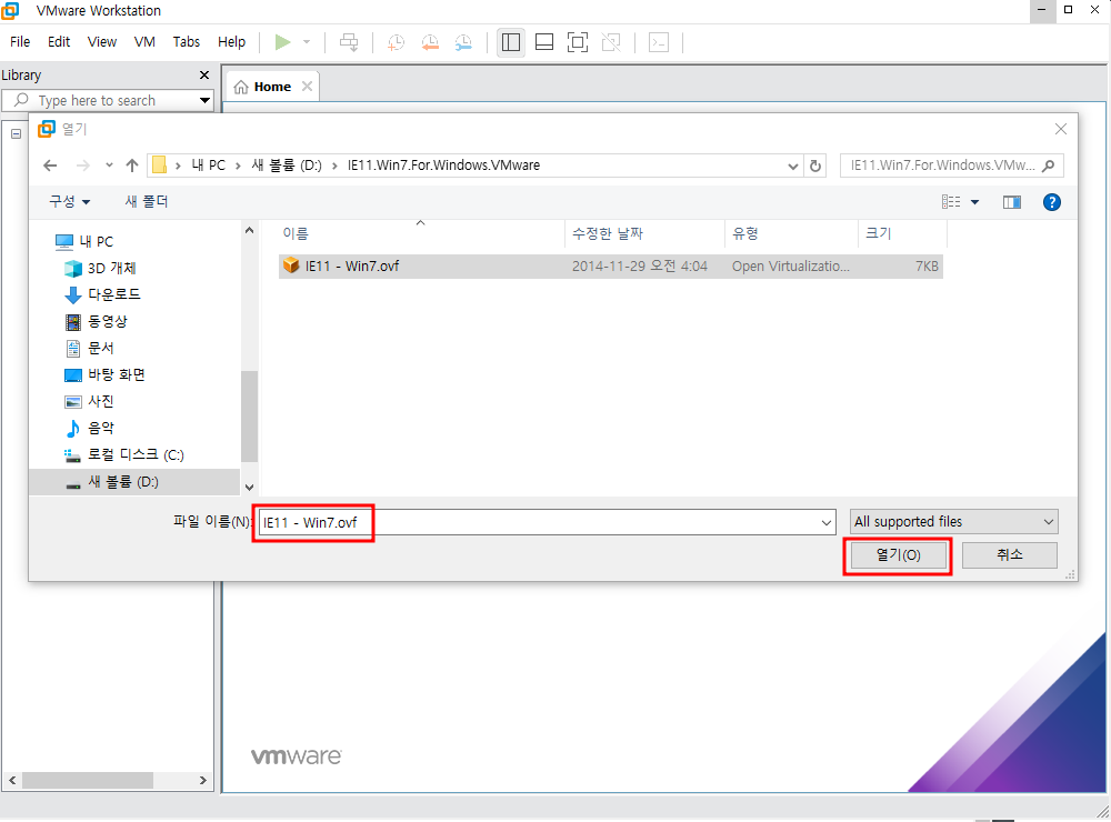 그림1의 File - Open 을 클릭하여 D드라이브에서 윈도우7 압축해제 파일의 ovf 파일을 불러온다.