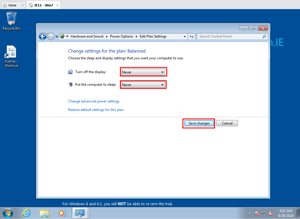 그림10과 같이 화면 꺼짐 및 컴퓨터 종료 시간을 Never로 설정 후 Save changes를 클릭하여 적용한다.