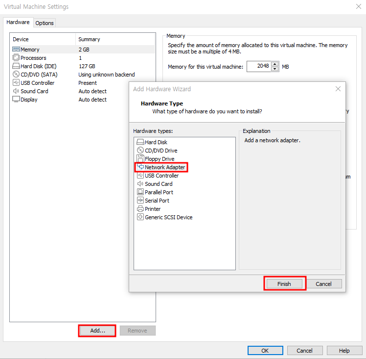 네트워크 어댑터가 없기 때문에 하단에 Add를 클릭 후 Network Adapter를 클릭 후 Finish를 클릭하여 추가한다.