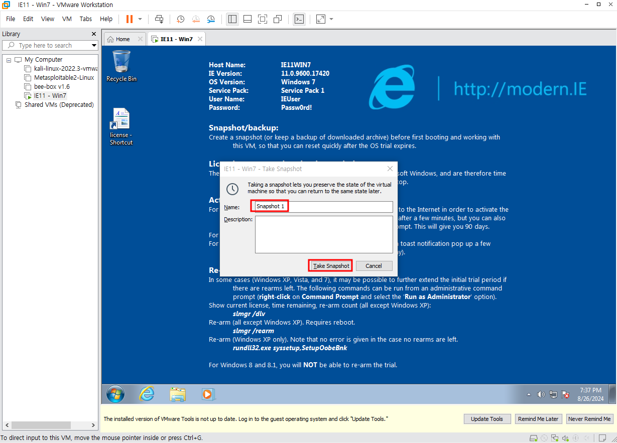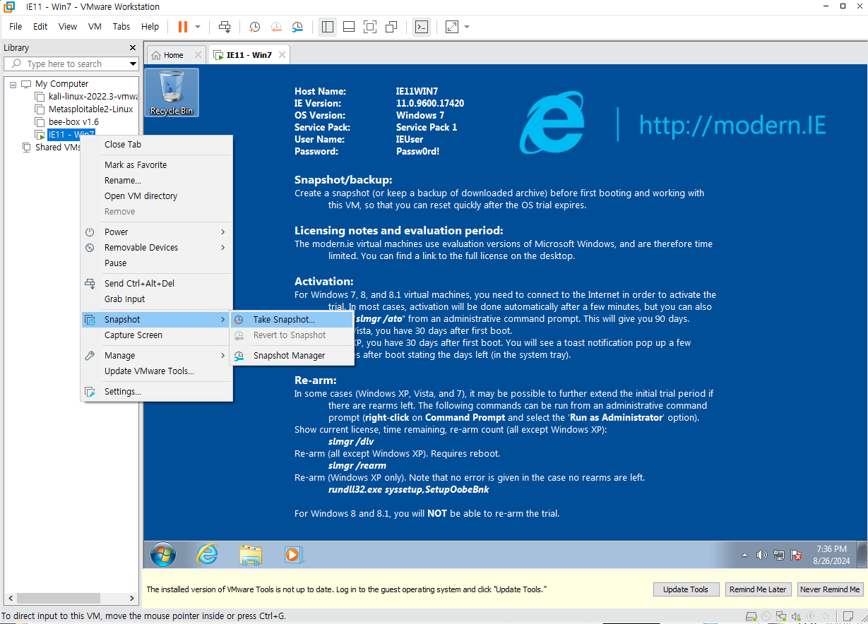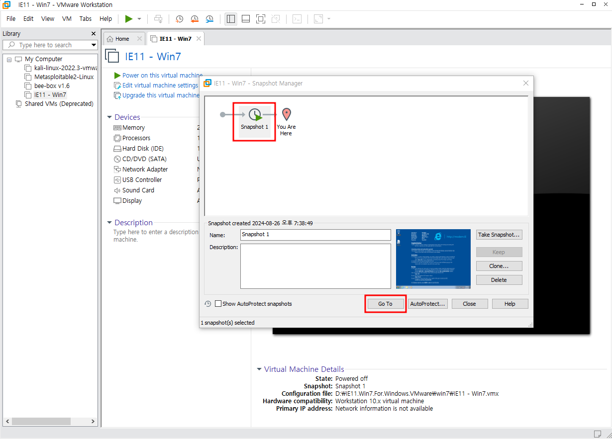 좌측 VM에서 IE11 - Win7를 마우스 우측클릭 후 Snapshot → Take Snapshot 으로 스냅샷을 저장한다.