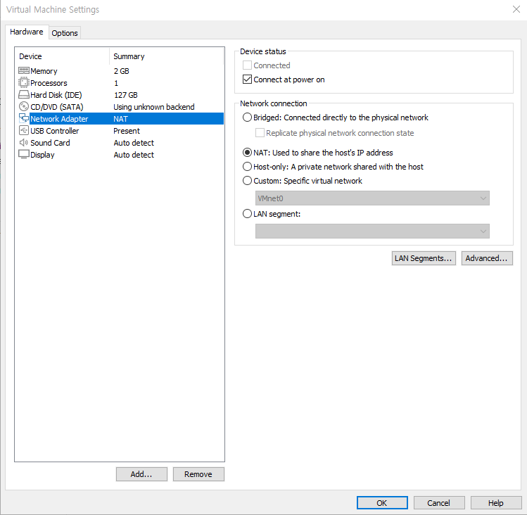 Network Adapter: NAT (호스트 PC로 부터 IP 할당 받음)