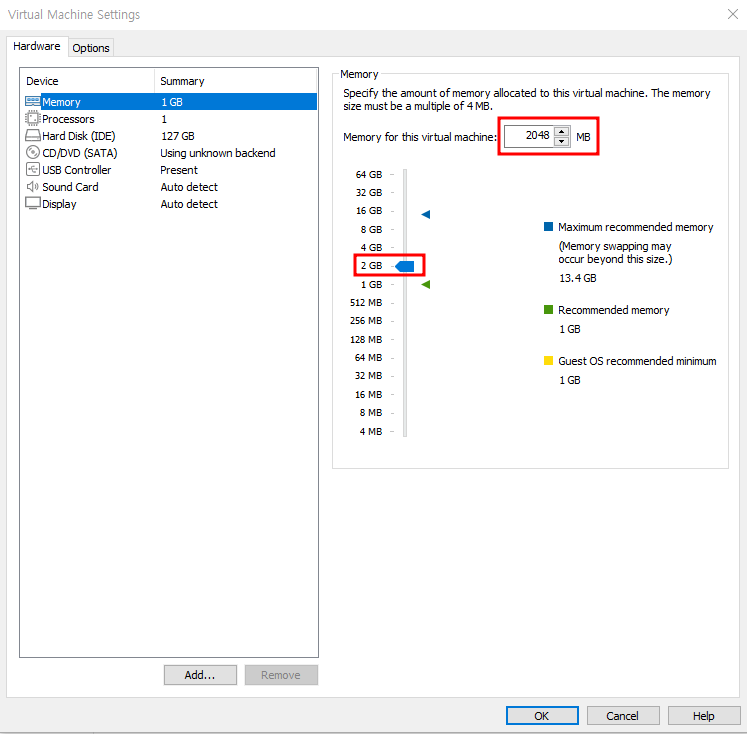 호스트 PC의 환경에 따라 Memory와 Processors 용량이 달라질 수 있지만, 요즘 PC 환경에서는 무리없이 사용가능한 용량이다.