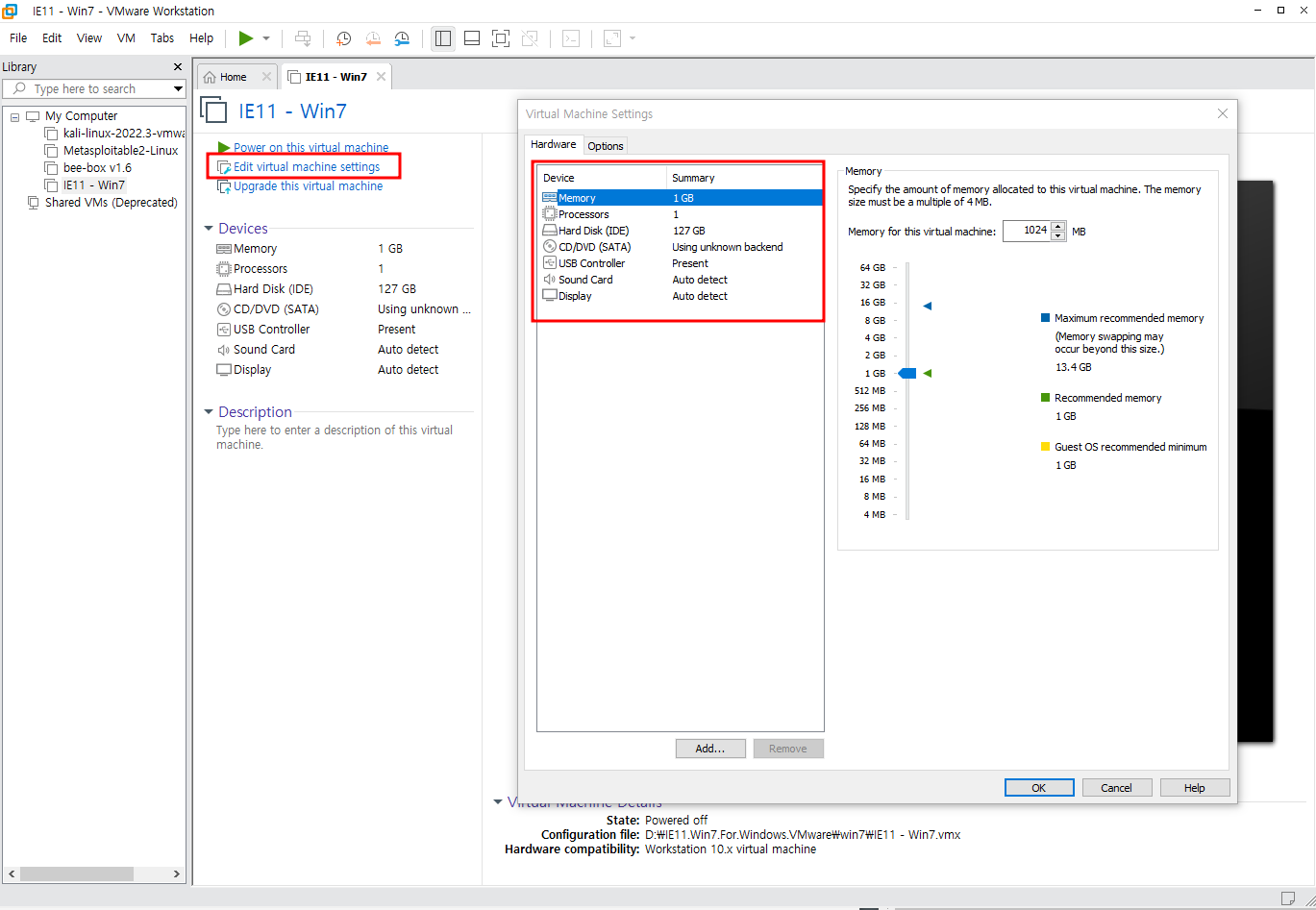 Import 후 Edit virtual machine settings 를 클릭하여 환경설정을 한다.