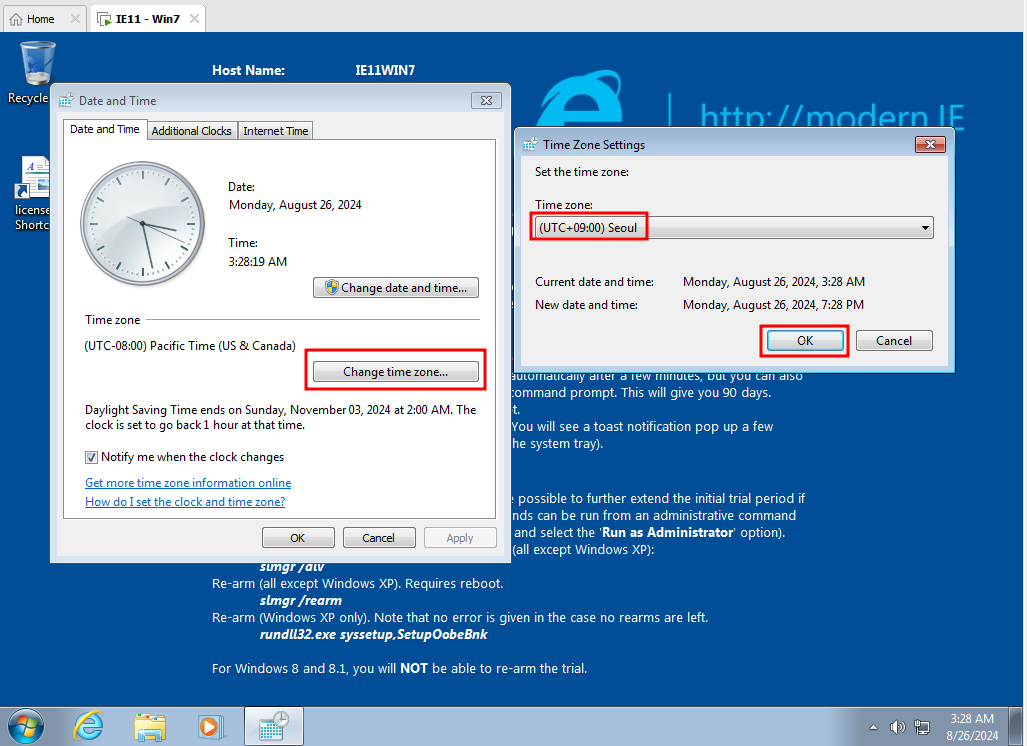Change time zone을 클릭하여 시간대를 (UTC +09:00) Seoul로 변경한다.