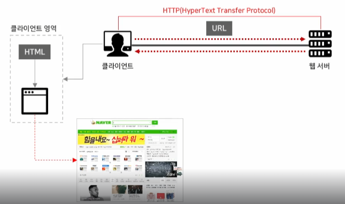 HTML = 웹 클라이언트가 웹 서버로 URL을 통한 자원 요청 후 HTML이 담긴 응답을 받으며, 웹 브라우저가 이를 해석하여 사용자에게 구조화된 인터페이스를 출력시켜 준다.