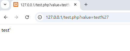 Apache 재기동 후 접속 하면 아래와 같이 test' 가 그대로 출력된 것을 확인할 수 있다.