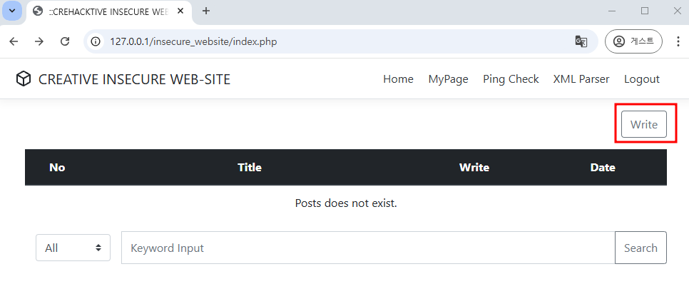 관리자 계정으로 로그인 후 우측 상단의 Write 버튼을 클릭하여 게시글을 작성한다.