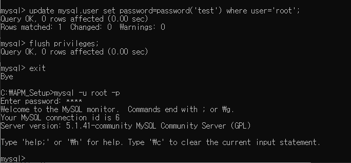 APM Setup으로 설치 시 MySQL 초기 패스워드는 apmsetup이다.