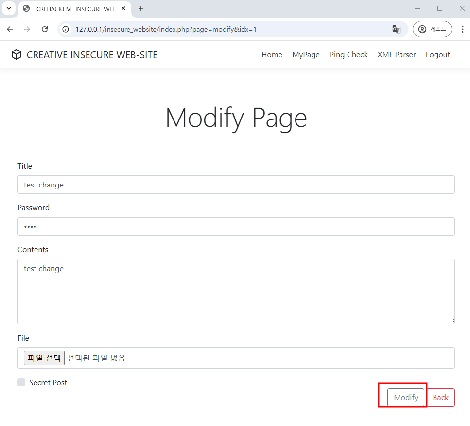 제목과 내용을 변경 후 비밀번호를 입력하고 Modify를 클릭하면 게시글 변경이 완료된다.