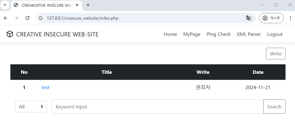 쿼리 복붙 후 DB, 테이블 생성 및 데이터 입력이 완료되면 insecure 홈페이지에 접속을 시도한다.