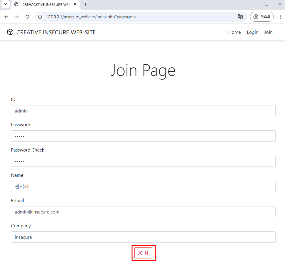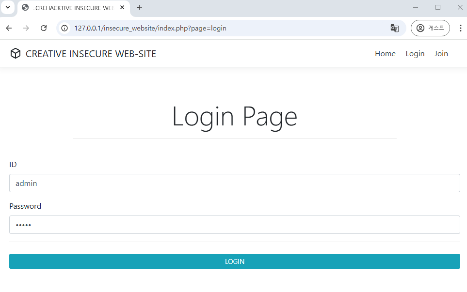 브라우저에서 127.0.0.1/insecure_website 입력하여 접속을 시도