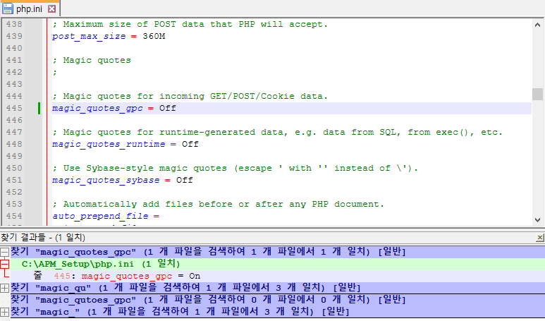설치 후 C:\APM_Setup 경로의 php.ini 파일 내 magic_quotes_gpc 를 Off 로 변경해준다.