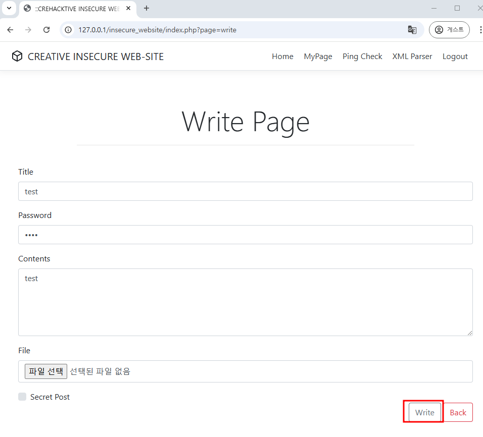 test 라는 게시글을 작성 후 비밀번호도 test 로 설정 후 Write 버튼을 클릭하여 작성 완료한다.