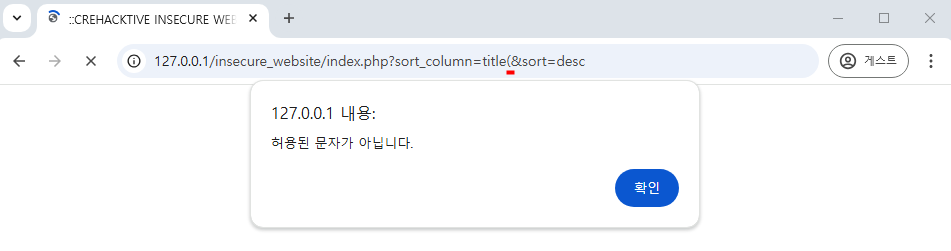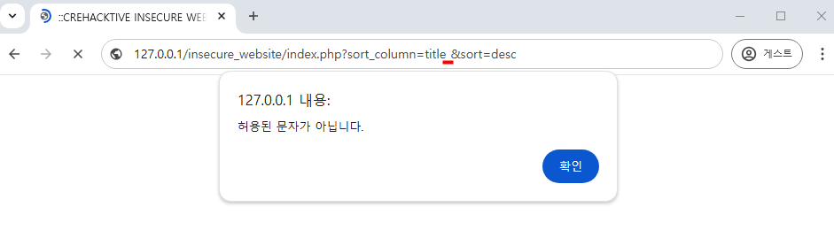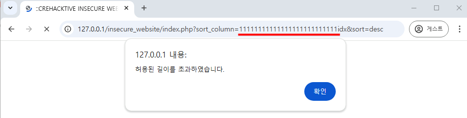 sort_column 부분에 특정 문자열을 여러번 입력하니 10글자를 초과하게되어 다음과 같은 에러메시지가 발생한다.