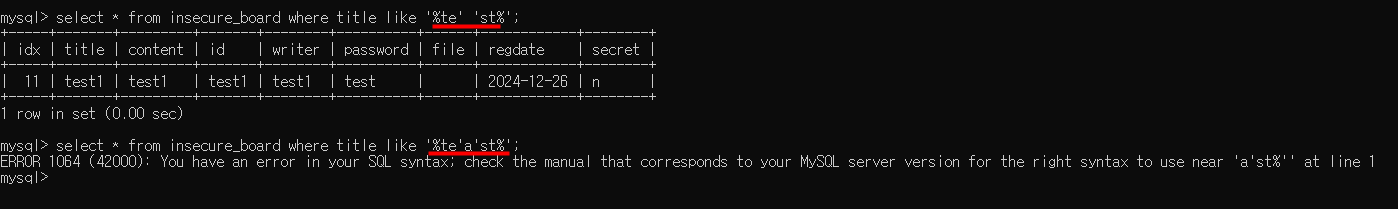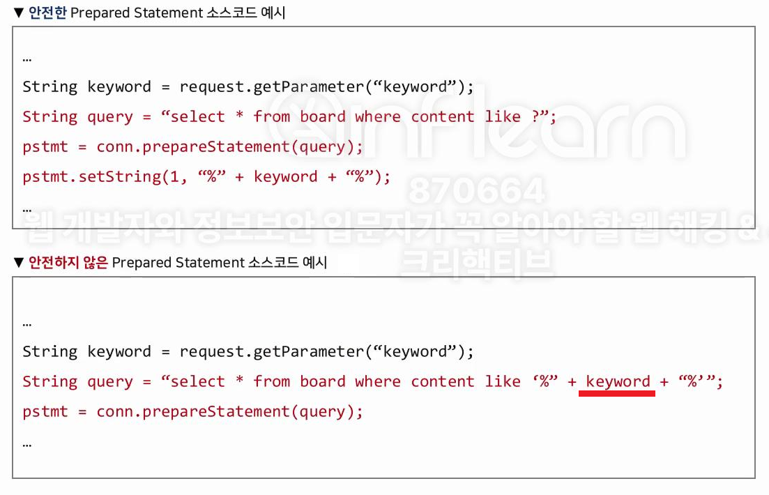 pstmt = conn.prepareStatement(query); 구문 이전에 "select * from board where content like '%" + keyword + "%'"; 구문을 사용하여 사용자 입력값이 바인딩되는 경우, SQL Injection에 취약하게 된다.