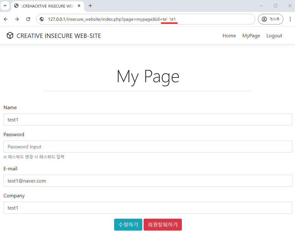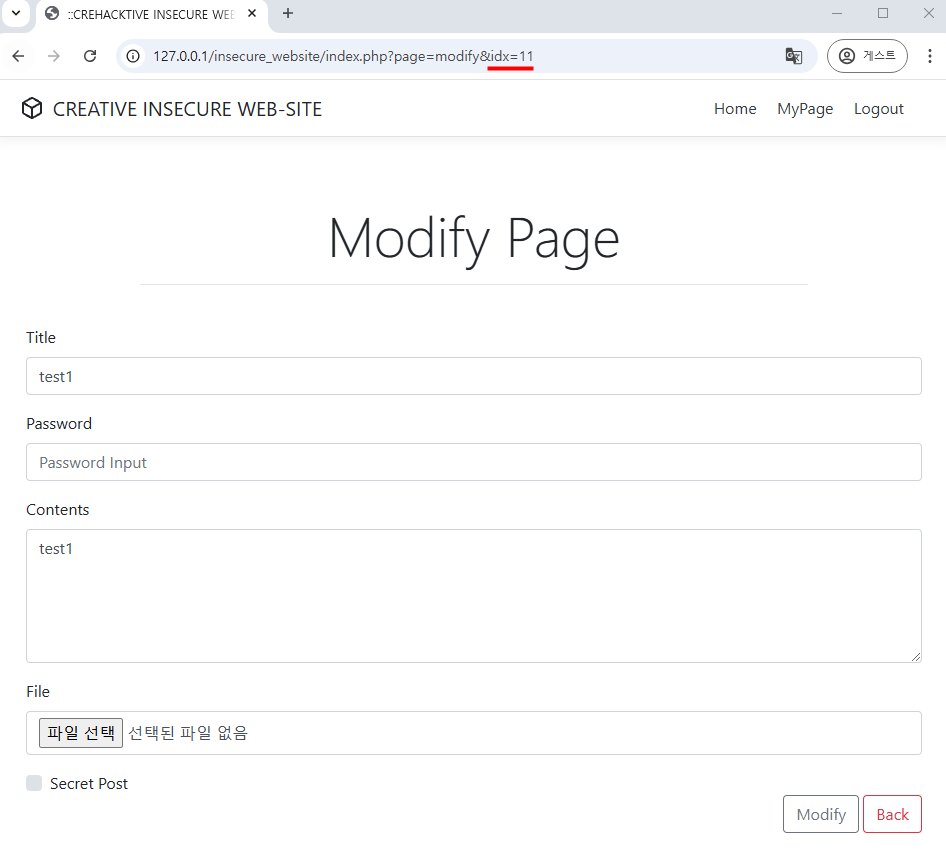 수정 페이지 또한 idx 가 SQL Injection 에 취약하므로 시큐어 코딩을 적용해야 한다.