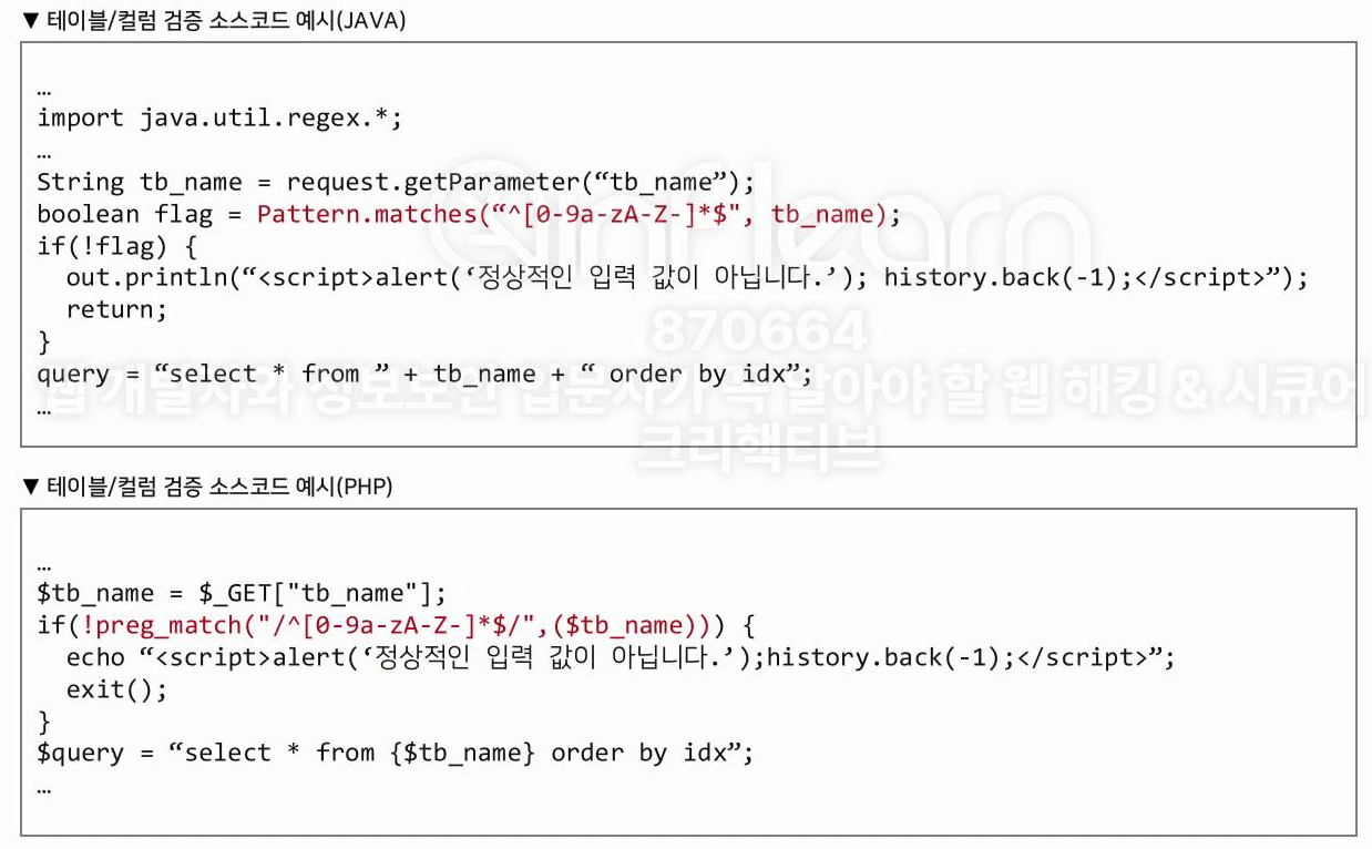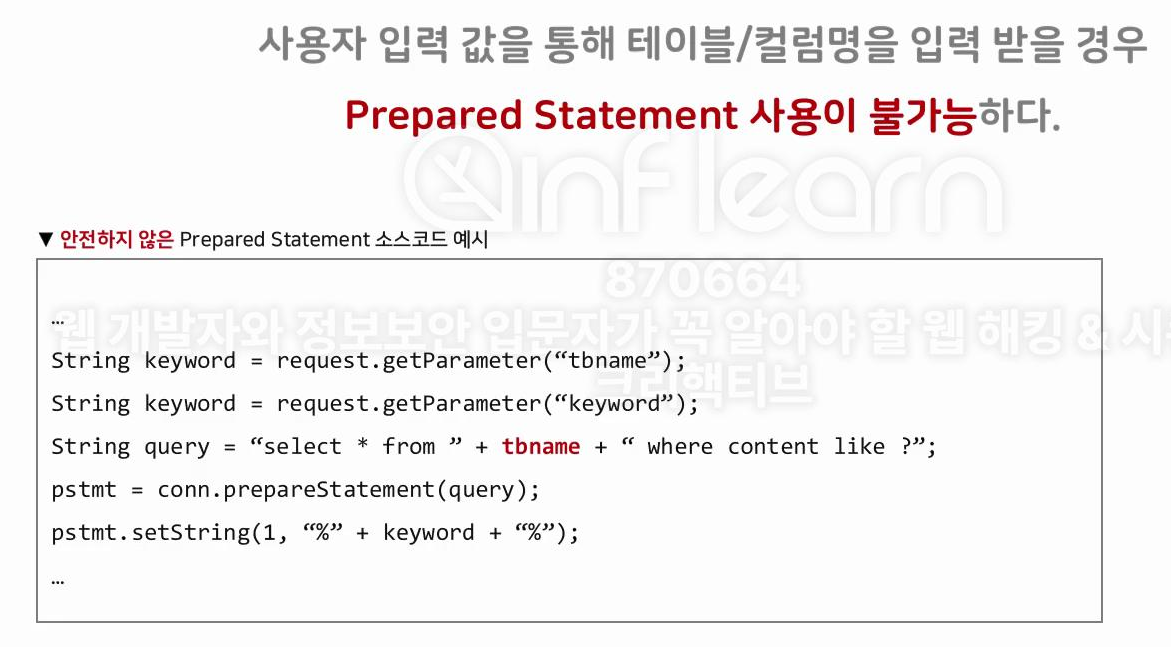 사용자 입력 값을 통해 테이블/컬럼명을 입력 받을 경우 Prepared Statement 사용이 불가능하며, 이때는 사용자 입력 값 타입에 따른 입력 값 검증 로직을 구현하여 안전하게 사용할 수 있다.