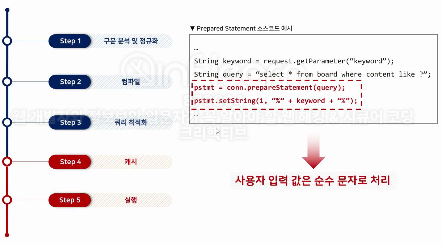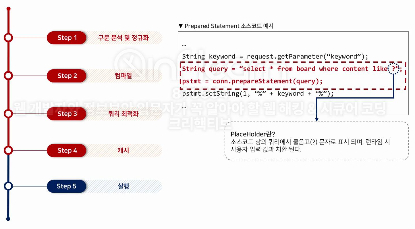 안전하게 사용하기 위해서는 PlaceHolder 를 사용하여 프리 컴파일 이후에 사용자 입력값을 바인딩해야 한다.
