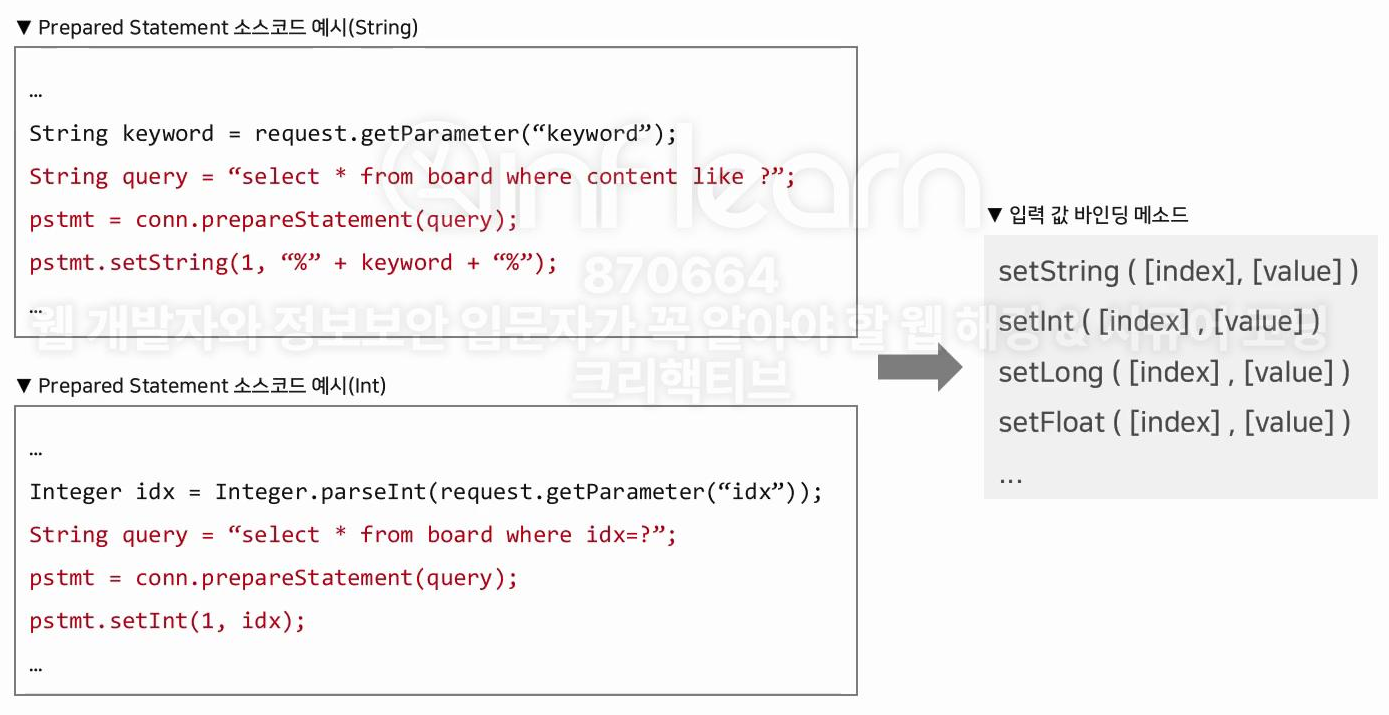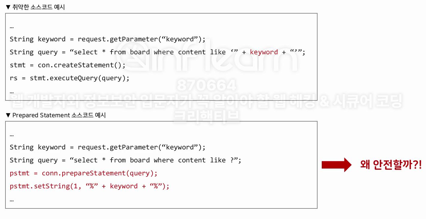 Prepared Statement를 안전하게 사용해야한다. 잘못 사용하면 취약할 수 있음