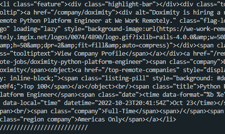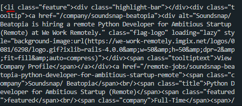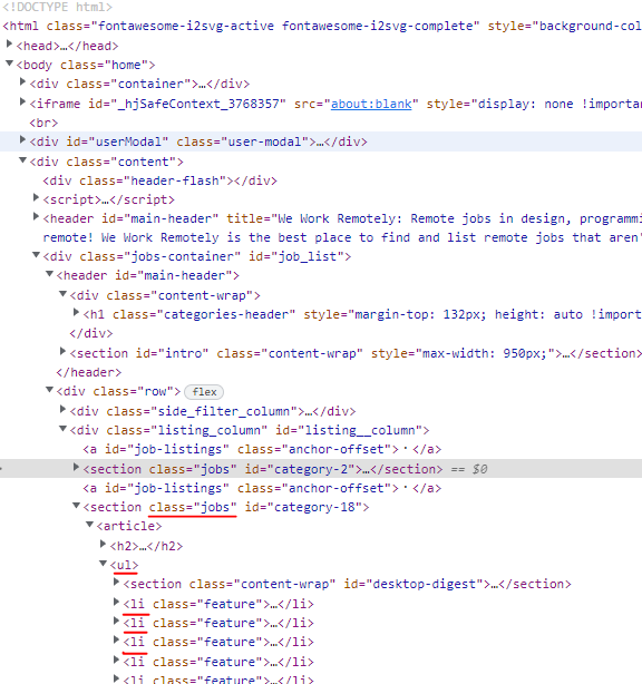 전체 HTML 코드에서 class 가 jobs 인 section 안에 ul 안의 모든 li 를 출력하려 한다.